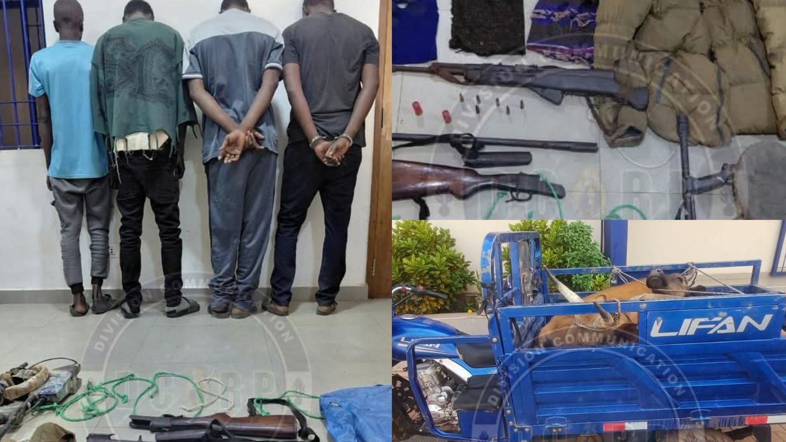 L’opération a également conduit à la saisie d’un fusil AK-47 avec six munitions de calibre 5,56 mm, d’un fusil de chasse accompagné de deux cartouches de calibre 12, d’une machette, de deux bœufs, d’un détecteur d’or, de plusieurs cagoules ainsi que de quatre motos, dont deux de marque TVS, une de marque Bravo et une de marque Jakarta.
